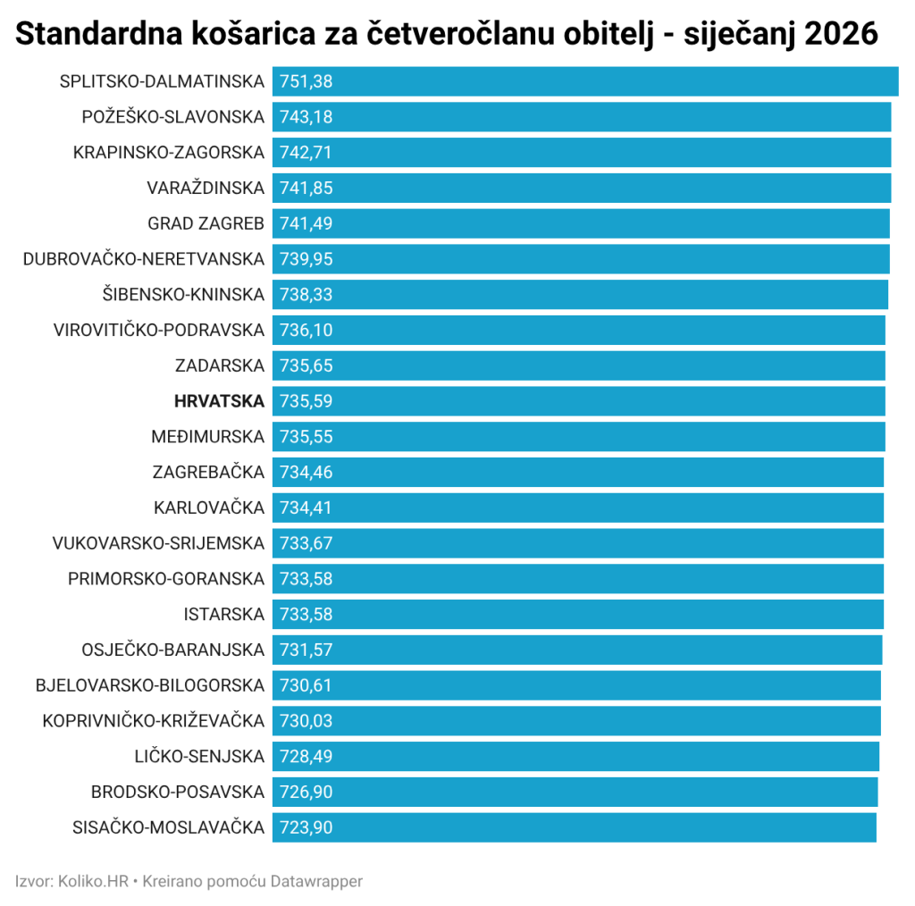 “Iako se poskupljenja ne čine velika, ne treba smetnuti s uma da su dva eura na mjesečnoj razini nekadašnjih 15 kuna, a da su 735,59 eura, koliko košta standardna košarica za četveročlanu obitelj, nekadašnje 5.542 kune. Osim toga, standardna košarica je na polugodišnjoj razini poskupjela čak 17,49 eura, a to je 131,78 kuna”, kaže Siniša Bogdanić s portala Koliko.HR
