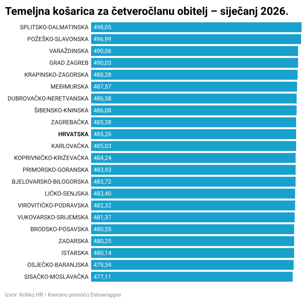 ZAGREB – Prosječna cijena temeljne prehrambeno-higijenske košarice za četveročlanu obitelj u siječnju 2026. iznosila je 485,26 eura, što je 1,22 eura više nego u prosincu, kada je nacionalni prosjek bio 484,04 eura. Pokazuje to redovito mjesečno istraživanje koje provodi portal za usporedbu cijena Koliko.HR u suradnji s Hrvatskom udrugom za zaštitu potrošača (HUZP).