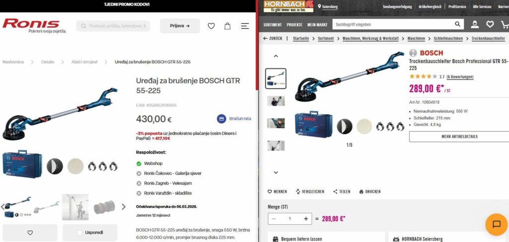 Da je kojim slučajem legendarni Mladen Delić živ uskliknuo bi ponovno: „Ma, ljudi, je li to moguuućeeee!“ Naime, jedan naš majstor „ulovio“ je novi nevjerojatan primjer diskriminacije cijena na policama trgovina, ovaj puta s alatom. Riječ je o Bosch Professional GTR 55-225 (brusilica za zidove – popularno zvana „žirafa“).